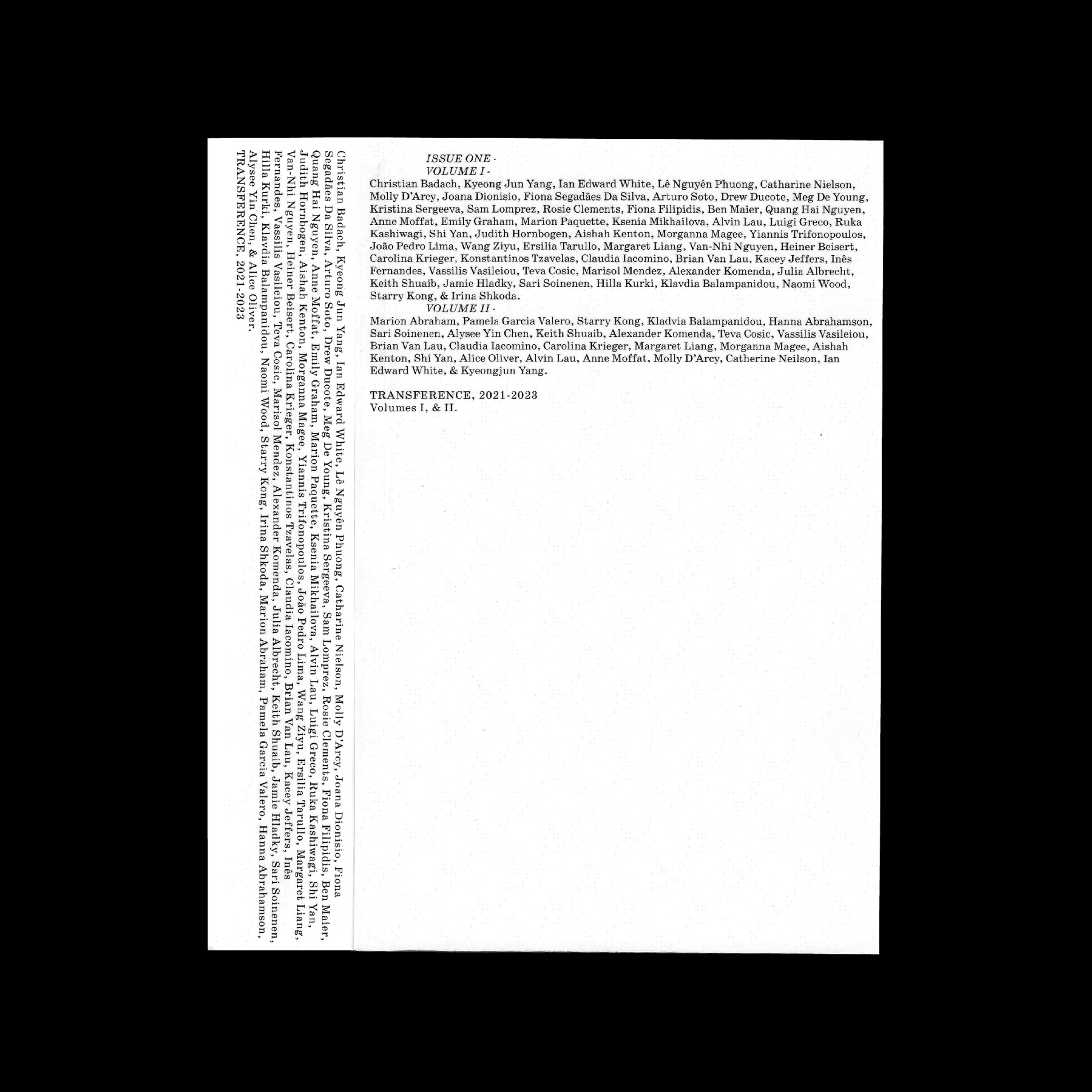 TRANSFERENCE Issue One, September 2023. ISBN: 960-4-71-400002-1.